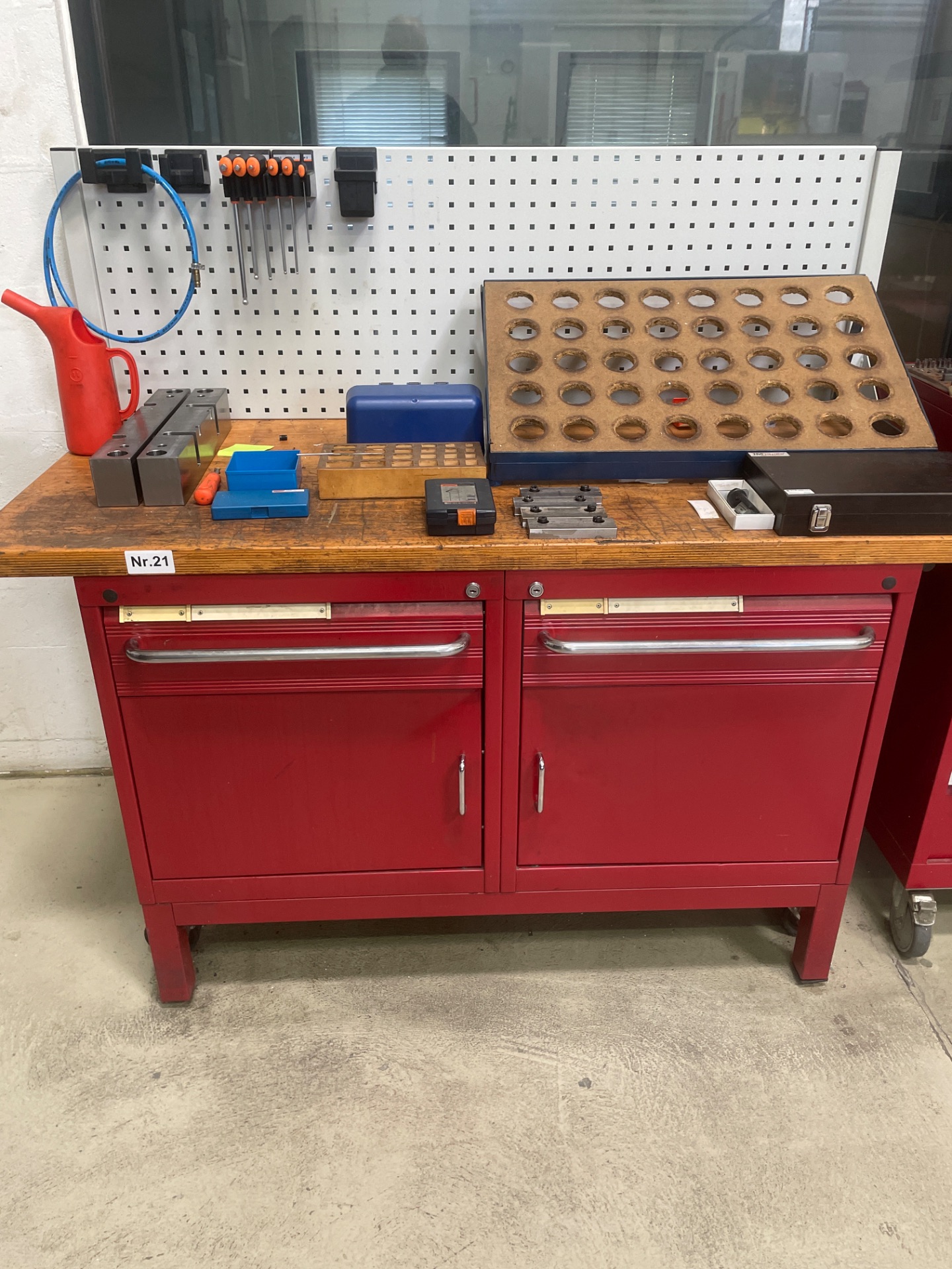 Zum Verkauf steht eine stabile Werkbank (Bank 14) mit großzügiger Arbeitsfläche, integrierter Lochwand sowie einem untergebauten Schubladenschrank.